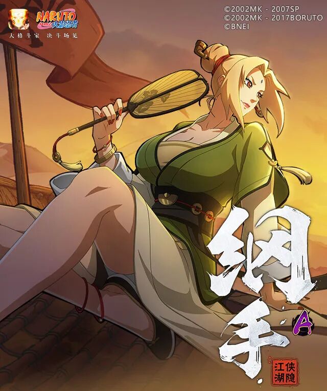 纲手「侠隐江湖」的普通攻击共5A,1A持扇挥击,2A旋转攻击位移到对手身后,3A以扇为刃造成凌厉的斩击,4A手持酒坛旋转挥舞攻击,随后扔出扇子击飞对手。若扇子命中对手,纲手会瞬身至对手身前,用冲拳给对手造成重击。