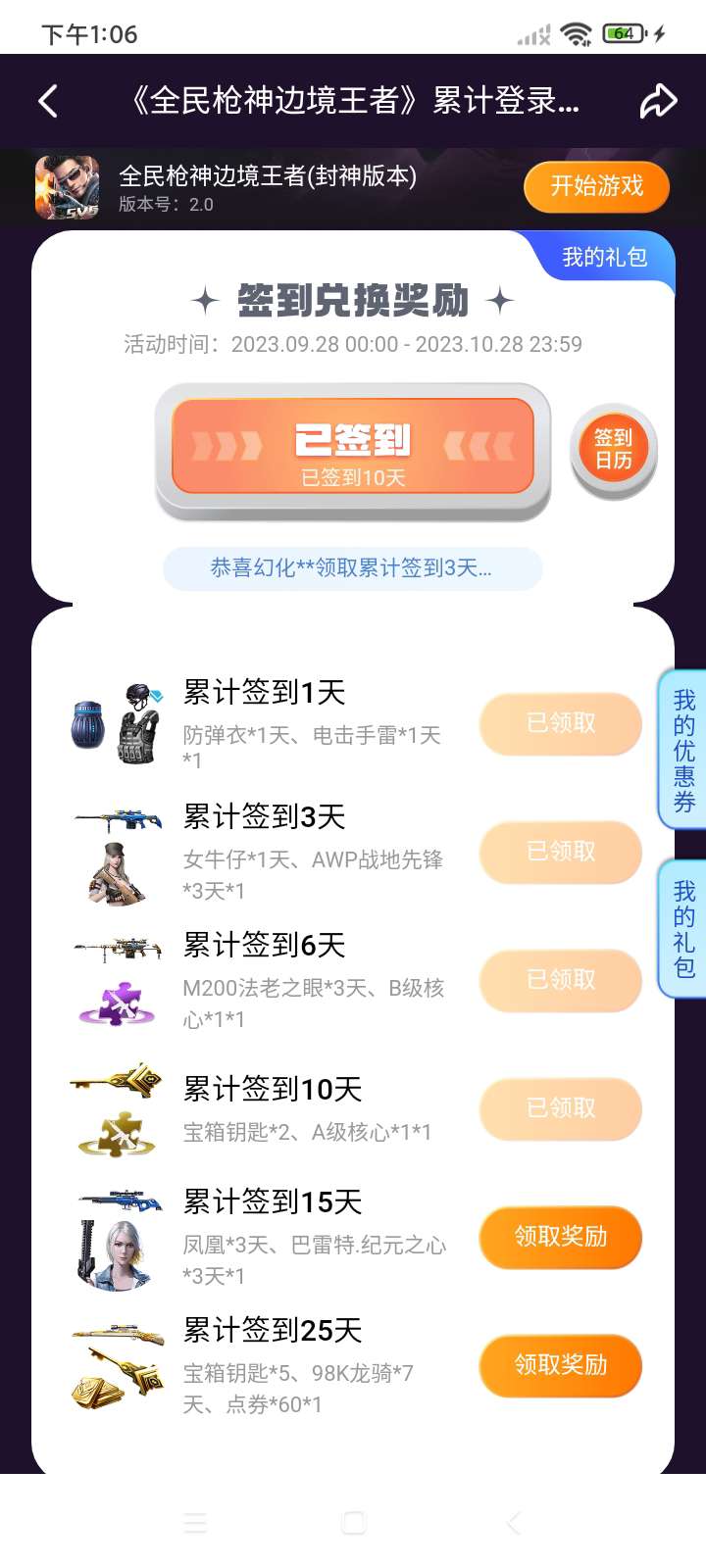 谢天谢地,我在活动结束前的最后一天领取到了签到十天奖励。