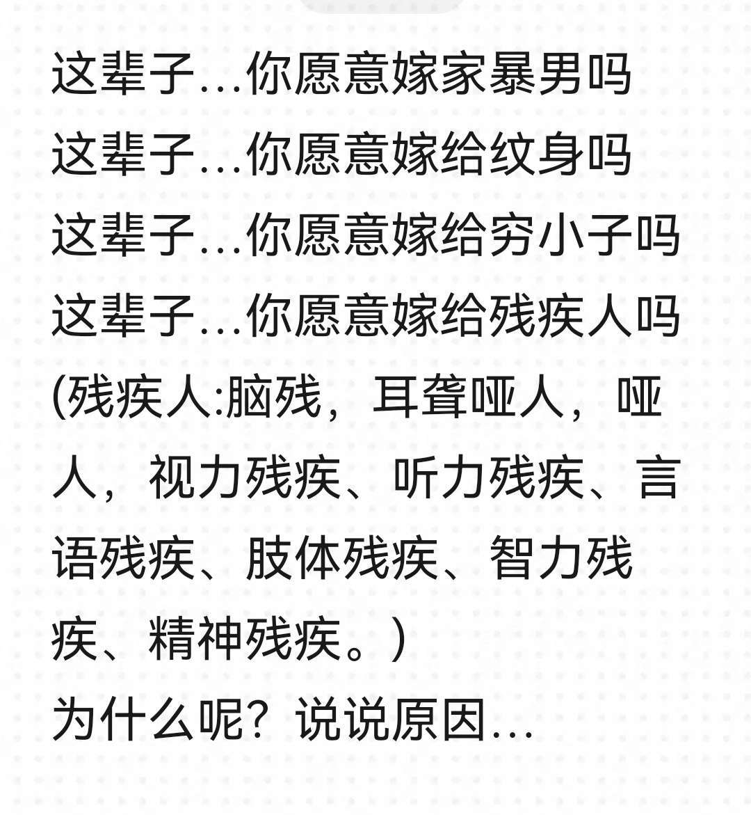 你愿意嫁给那个。你说原因吧。 你这辈子还在愿意吗…