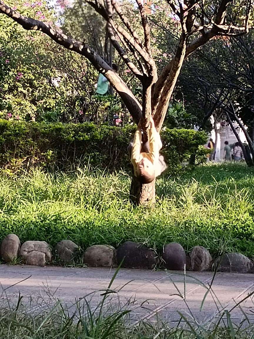 弟弟爬树时摔跤了。笑死我了。这姿势太搞笑。