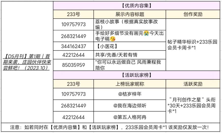 (注意:如若同时在【优质内容集】和【活跃玩家榜】,233乐园会员周卡*1 该奖励仅发放一次!)