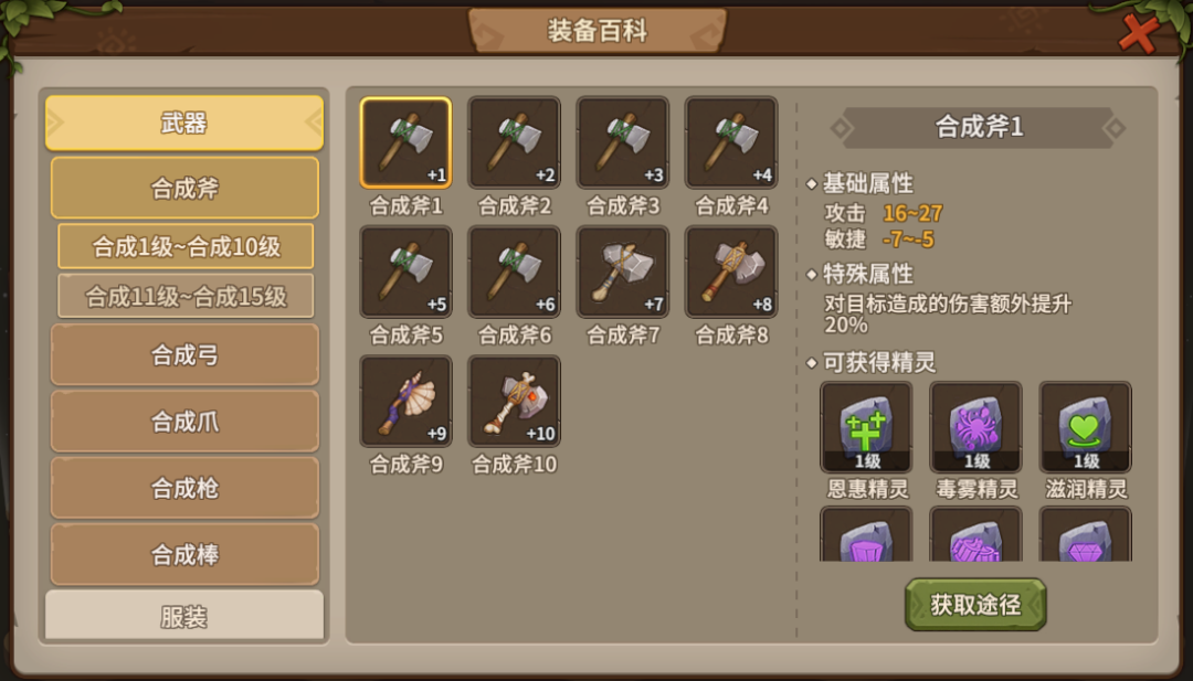游戏中装备获取途径主要有三个,分别是精灵王试炼、百人道场以及交易行购买获得,提升挂机效率的攻击型装备推荐斧子(单体高攻额外提升对目标的伤害,但敏捷降低),弓箭(群攻AOE能够同时攻击多个目标,但单体伤害降低)。
