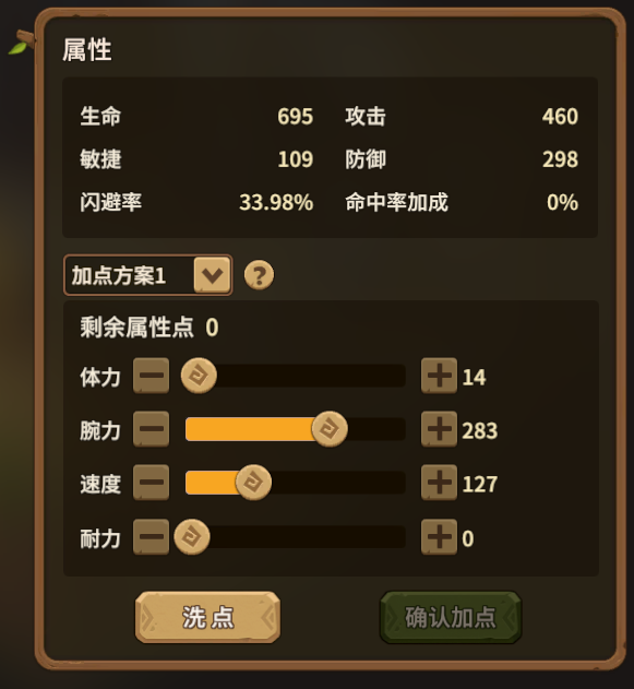 前期为了配合攻击型武器,斧头和弓箭,加点应偏向攻击与速度这两个维度,也就是游戏中的速度与腕力,来保证日常副本的过关效率,以便能够更快地完成日常任务,也能更高效的完成野外挂机。