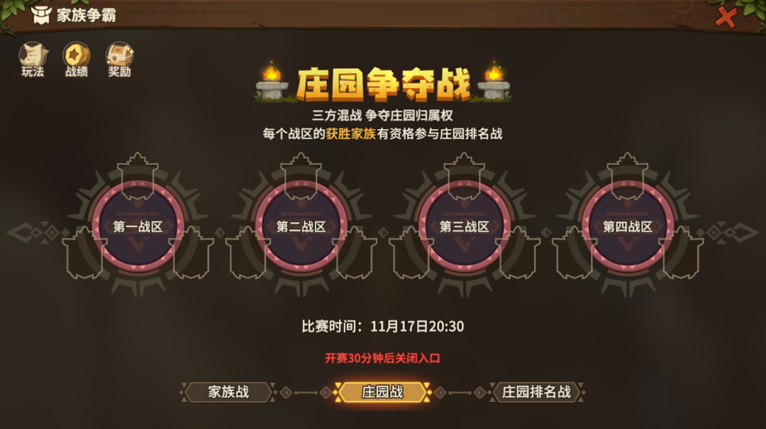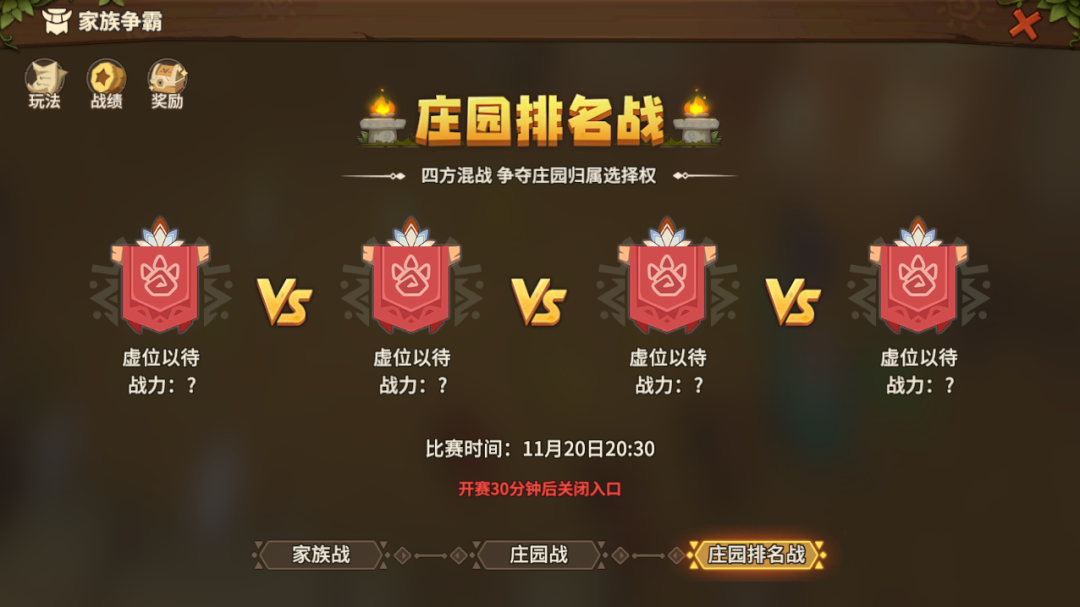 庄园排名战采取四方混战的形式,决出4个参战家族的名次。
