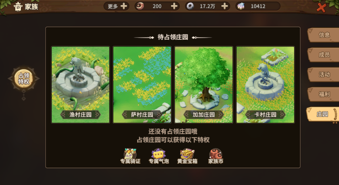 参战家族根据排名,依次选择加加庄园、萨村庄园、渔村庄园和卡村庄园的归属,家族长同时获得庄园对应的专属聊天气泡。
