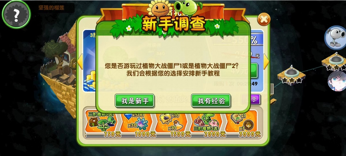 如果您在此前游玩过《植物大战僵尸》或《植物大战僵尸2》,已经熟悉了基础引导,可以选择“我有经验”选项,直接跳过前期的教程关卡,并直接获得以上关卡所对应的奖励产出,为大家节省时间。