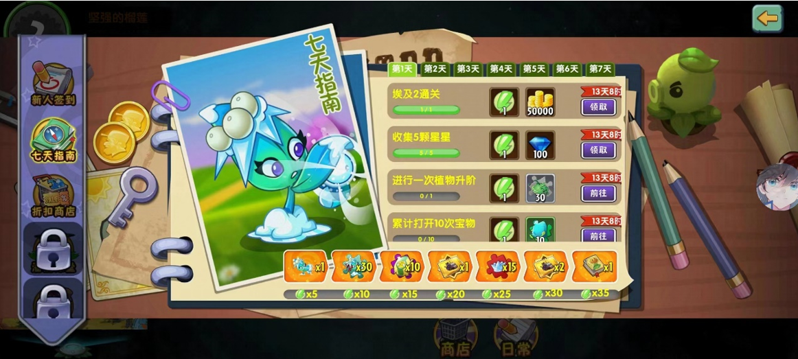 「七日指南」功能介绍:新手任务系统,活动期间任务随日期逐步解锁,完成任务可以获得经验及钻石、植物、挂件等丰厚福利,累积经验进度,获取紫色品质植物“槲寄冰仙子”、稀有道具“进阶书”、潘妮秘宝券等奖励!