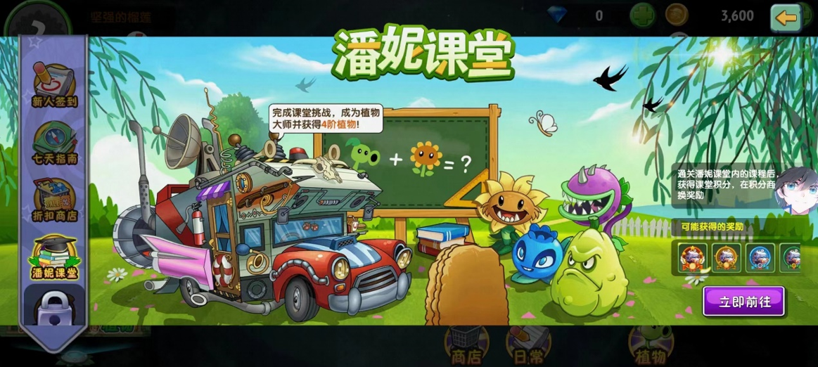 「潘妮课堂」功能介绍:完成课堂挑战,成为植物大师。“潘妮课堂”开课啦,参与答题或关卡试炼,获取5款实用的植物好帮手,原始向日葵、大嘴花、电击蓝莓、窝瓜、高坚果等你收入囊中,积攒课堂积分至高可解锁至4阶哦!