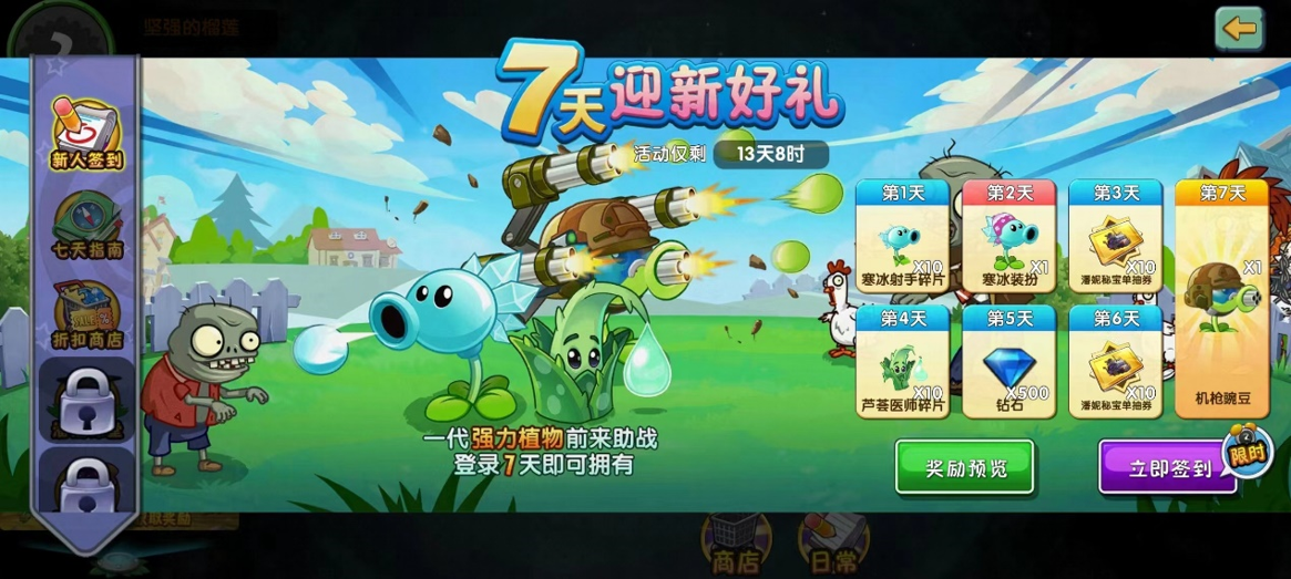 「新人签到」功能介绍:活动期间,每天登录游戏并参与签到,领取迎新好礼!不仅可以获得大量秘宝券、钻石、植物碎片及装扮,签到至第7天还可以解锁来自一代超人气植物“机枪豌豆射手”,推关打僵尸更轻松!