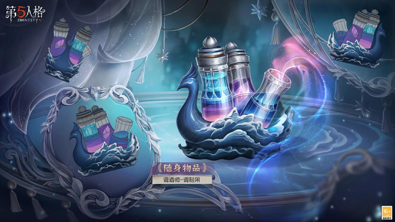 【稀世随身物品】调酒师-调制架是一个蓝白色的鸟型架子,底座与中部的白色波纹似海浪亦似羽毛。架子上放着三瓶颜色奇特的基酒,一道虚幻的粉蓝色烟雾从开瓶的酒中流淌出来,用如此梦幻的基酒调制的饮品将会是种怎样的味道?