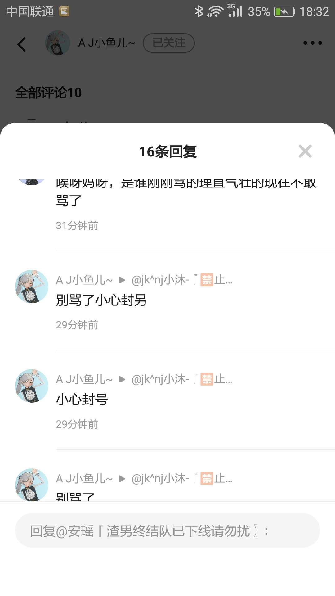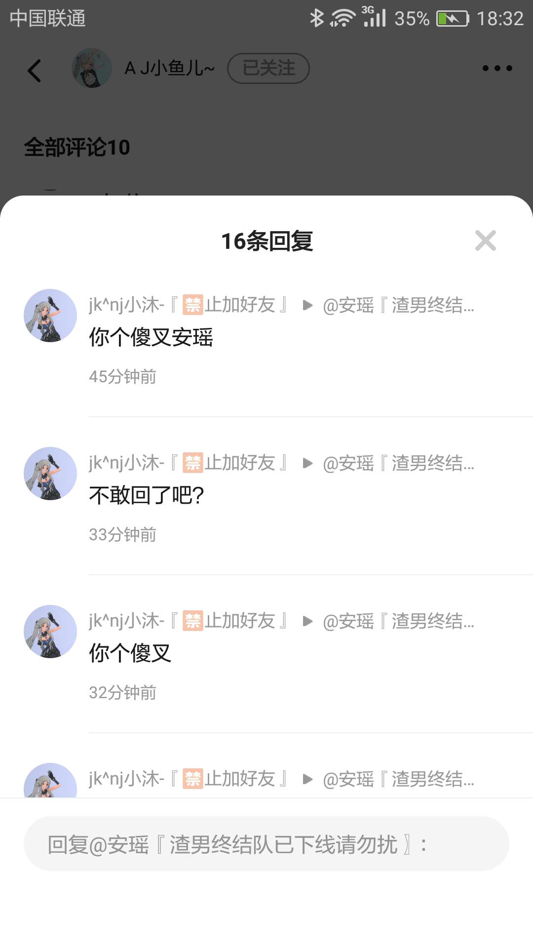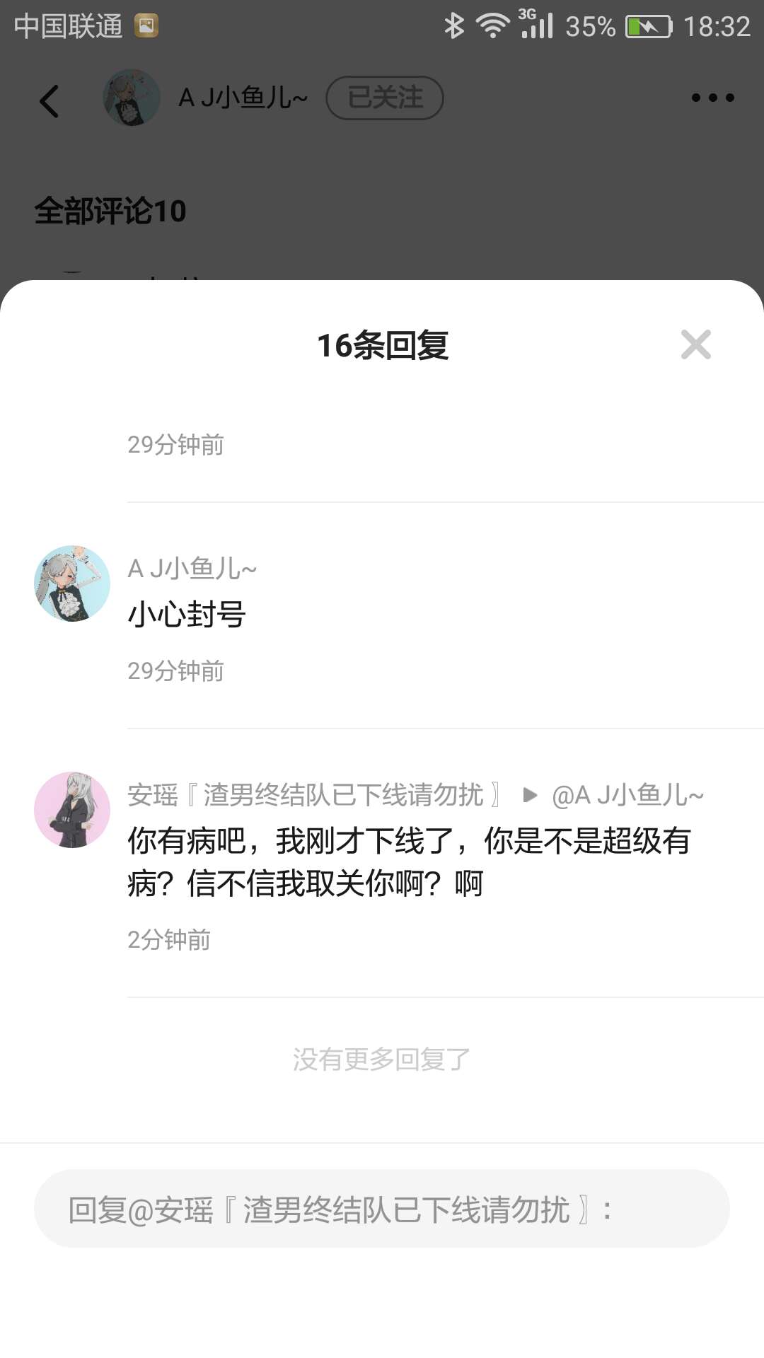 我告诉大姐姐我没骗小鱼儿,昨天我一上线一大堆信息就来了,小鱼儿的朋友骂我,小鱼儿骂我,小鱼儿的朋友想封我号,小鱼儿还是骂我不是小鱼儿他朋友你有病吧我,真没骗小鱼儿我咋骗了?我明明昨天刚上线呀,我都不知道怎么回事儿。还有啊,小鱼儿的朋友,你给我放尊重点,别骂我是傻,叉也别说,我不敢回刚才,只是下线了一小会儿去写作业。结果你们这么恬不知耻了。还不知道谁的错呢。我想证明自己。我给你们放证据怎么样?这就是小鱼儿的朋友,那么没有礼貌