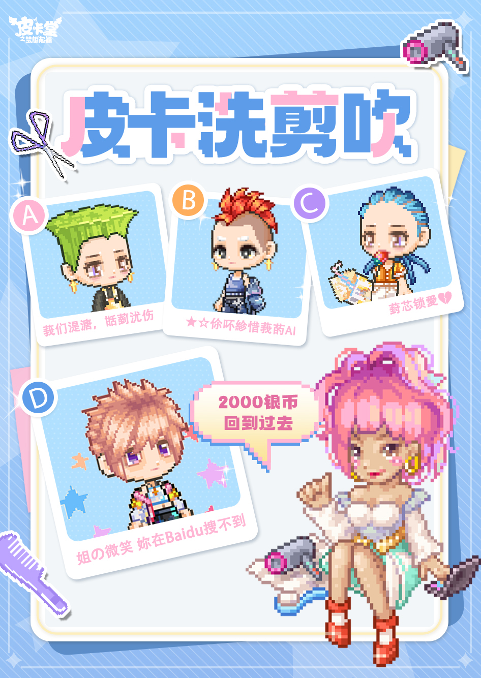 皮卡小镇有一位拥有独特风格的托尼老师“简一夏”,只要她正常发挥,小镇居民们都能轻松梦回SMT时光。简一夏说最近理发店很冷清,她提供了一份最近的理发店新作品,希望本喵帮她发发传单揽客,额…本喵看完觉得冷清不无道理,如果非要选的话……皮卡亲们会选哪一款发型呢?
