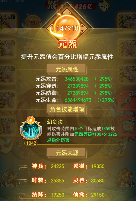 元炁是灵界中一种特殊的能量,掌控元炁者可得天下!御灵师所获得的元炁值越多,自身实力将会越强大。元炁值可以通过神兵、灵羽、时装、灵兽、法阵、仙禽、法珠的各个幻化获得;元炁值可增幅角色技能-幻剑决,元炁等级越高技能效果越强,同时元炁值还能百分比增幅御灵师自身的元炁属性。