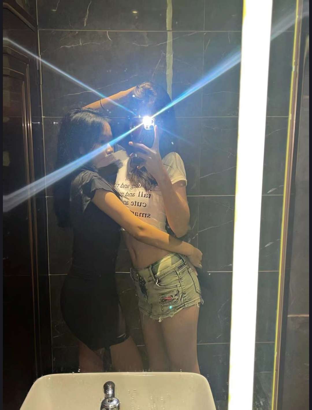 去酒吧玩啦,在酒吧洗手间和姐妹拍个照