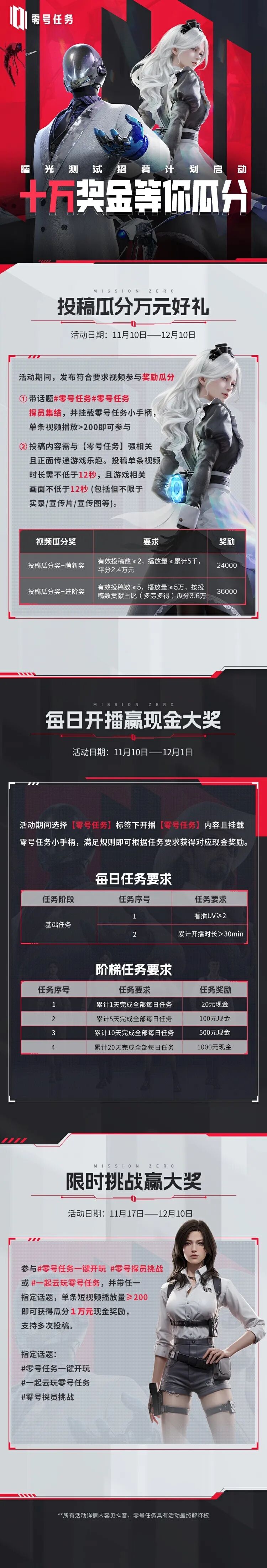 请注意,活动细则详情请参考抖音内活动页面,活动最终解释权归《零号任务》所有。