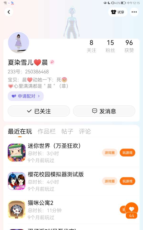 我是在百度上看到的我看到一个游戏非常好玩,(注:现在没有了)是一个小人在马路上走看到和自己一样数字的就走过去和他成为一个人,人数越多头上的数就越大,然后嘞,我玩的是樱校我那时什么也不懂就下载了,玩了一些日子就迷上了樱校,后来我看到了一些联机游戏:蘑菇新世界丶我的餐厅这些后来都没有了我在蘑菇新世界里边遇到了梦姐她是梦团长我做了她团的团宠,她带我玩游戏,带我玩233广场我真的很开心(✪▽✪)所以从那以后我就没退过233到了后来她退了把团也解散了,几乎团里只有我还在😥 然后嘞我就遇到了樱钙♡^▽^♡我做了她的徒弟我真的很欣赏她!我在她主页知道了她的师傅叫苏墨颜我加了她的好友从那以后鹊悸就加入了她们俩(樱钙丶苏墨颜)然后吧,我当时就是退了一阵子回来以后发现号不见了变成了新号,我就又在那个新号里面玩,又发现那个新号也不见了🙊!!!从那以后我换了好多号!我在最新号里认识了欣晚丶小萝她们两个人都是大佬我就求欣晚告诉我怎么把我以前的号找回来(注:这个号)我找到了这个号之后就立刻去这个号找樱钙和苏墨颜和鹊悸了我发现只找到苏墨颜师师的了樱钙和鹊悸一个影子都没找到后来才知道她俩把我删了🙁 我之后为了让以前的好友记的我就做了一个活动那就是每周抽一位好友做定制跑酷我记得很清楚我是用以前的小号做的然后呢我在大号发帖,我当时因为学业的关系只做了一位好友,之后就没做过了就因为我小号发不了帖子,然后嘞我想参加娜娜姐的活动"逃离大扫除"!!我就自己做跑酷让初雪,帮我发帖,没想到她收获了好多粉,就因为我怕娜娜说是盗的跑酷,所以我就没在跑酷上写上我的名字,现在想起来后悔极了😞 !!!!