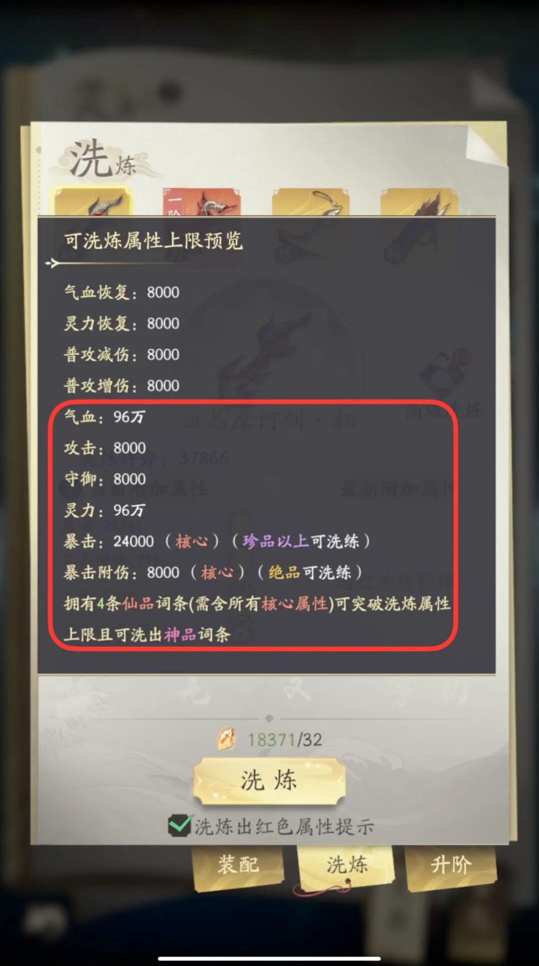 前4个部件(柄、刃、穗、鞘)洗炼的属性上限值一样,如下图所示: