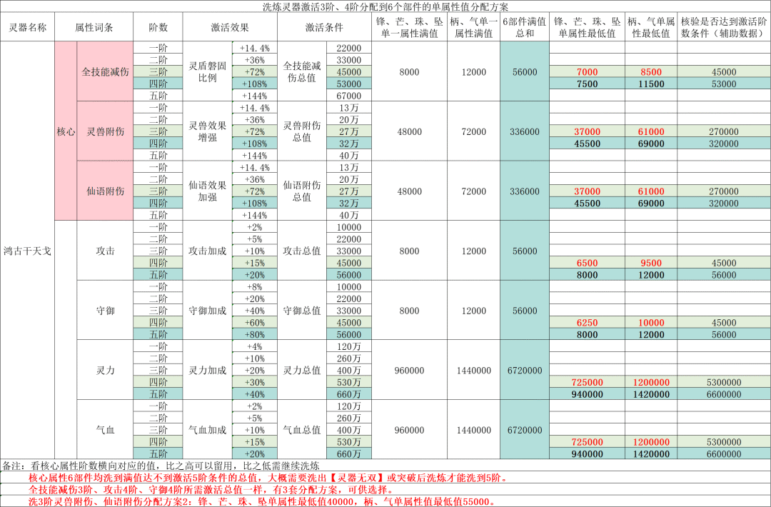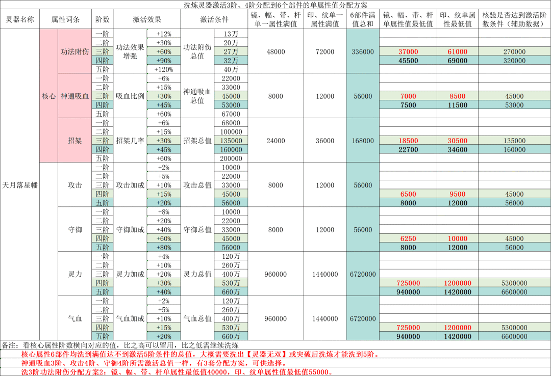 备注:每把灵器最后一个部件前期大多为蓝色、紫色品质,核心词条最低需紫色品质。