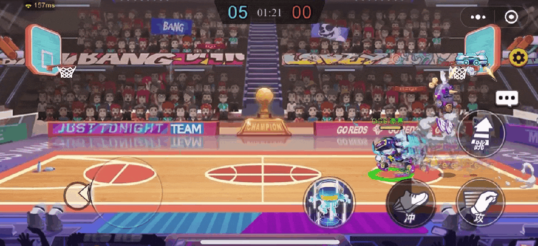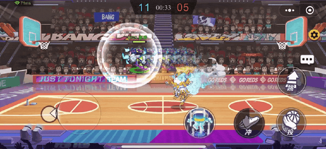 如果我们拿到了球,对手距离非常近,我们离球框还比较远时就可以跳起来用【虚拟闪现】+【冲】,瞬间到达篮筐扣篮。