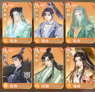 ①门客自带标签,在布阵界面中,可以看到输出、防御、控制、辅助自眼,分别对应如下: