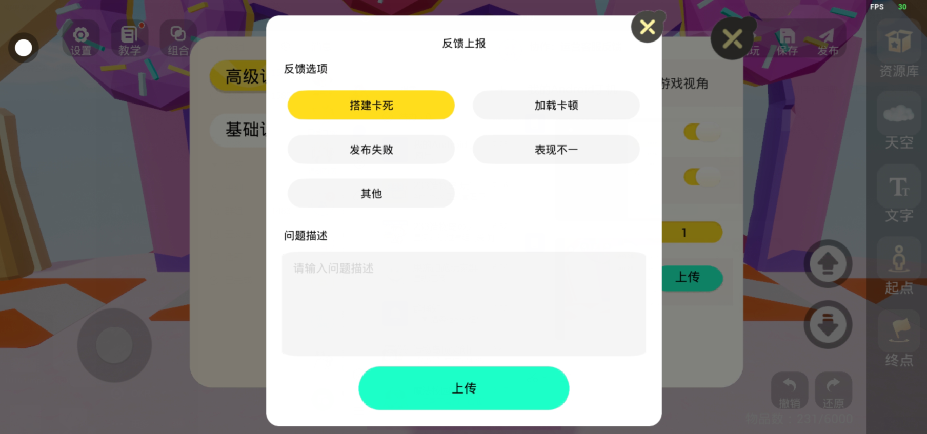 大家如果在搭建时遇到的各种问题,可以打开设置面板,选择"上传",进行问题反馈,反馈的时候选择问题种类,尽量描述清楚自己遇到的问题,之后点击上传即可。
