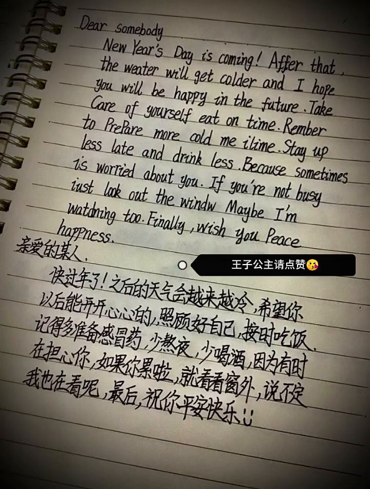 亲爱的某人, 快过年了!之后的天气会越来越冷,希望你以后能开开心心的,照顾好自己,按时吃饭.