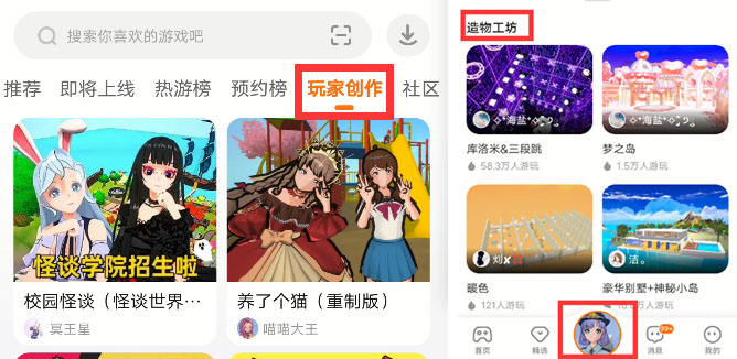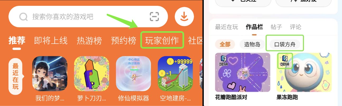 近期乐园首页新增【玩家创作】栏目,个人页面-作品栏也新增了【口袋方舟】【造物岛】分栏,一些小伙伴私信官方口袋方舟是什么?和造物岛有什么区别?今天我们就来为大家解答。