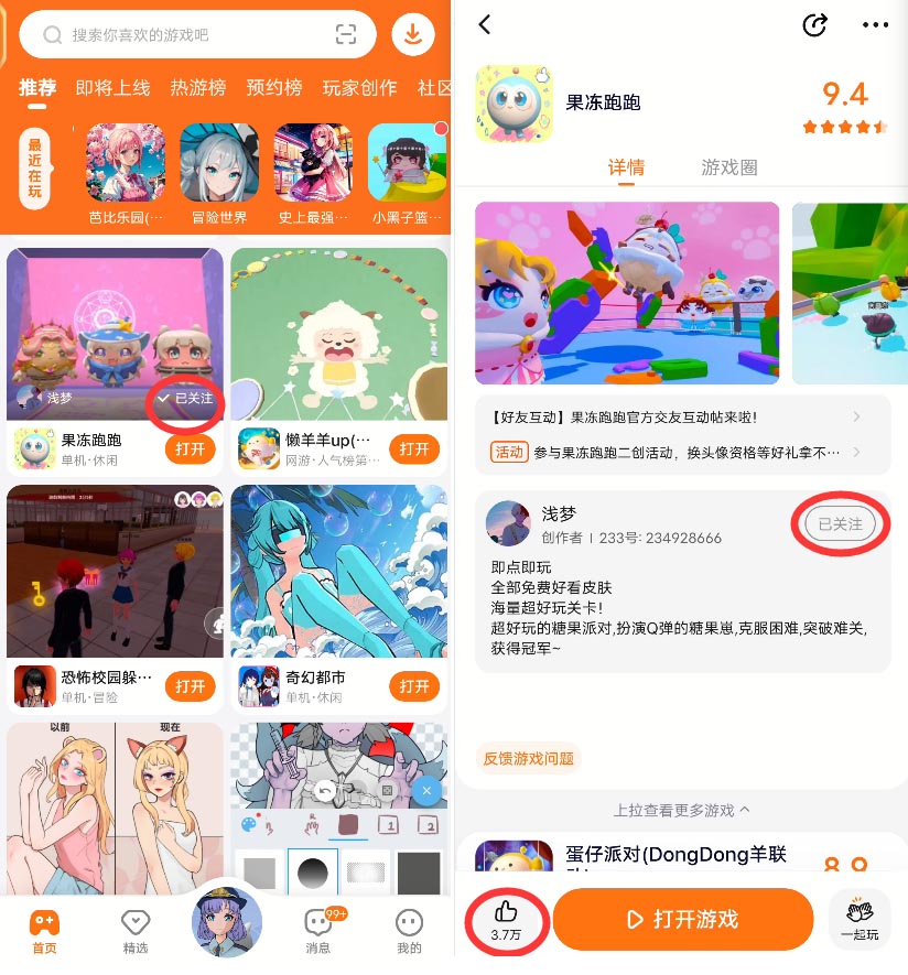 2.点赞和关注:如果你喜欢某个游戏作者的作品,点赞、并且关注他的个人页面,这样将能获得后续他的更新的内容和推送。这也是对作者的一种鼓励和支持,让他们感受到大家对他们作品的喜爱。
