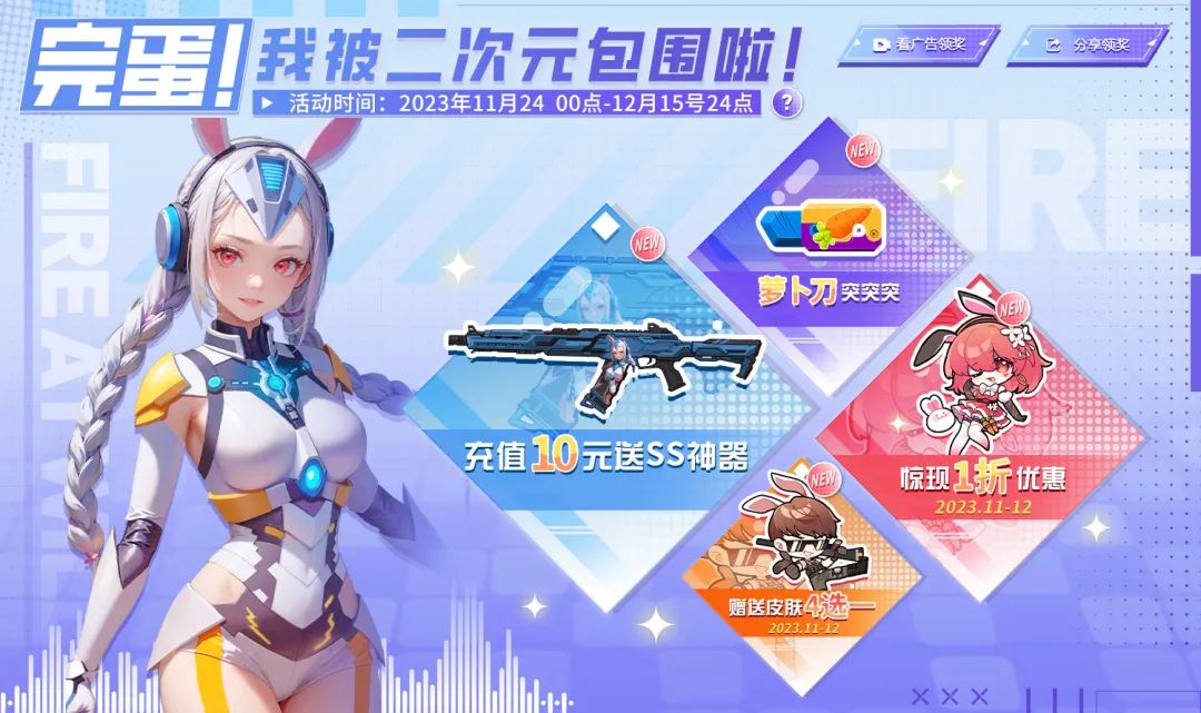 11月24日(周五),二次元合集活动上线,SS级主武器:AR15-妲己、AK47-月德·玲;SS级近战武器:萝卜刀、王者级皮肤降临战场!达成任务即可获得1折券、免费皮肤,枪神们千万不要错过了哦(#^.^#)