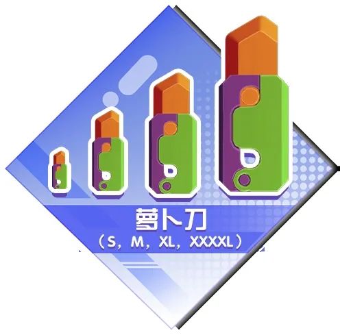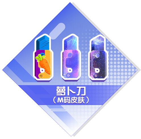 同步上线的还有标准型号萝卜刀-M全新幻彩皮肤(依次从左到右):萝卜刀-五彩缤纷、萝卜刀-星辰、萝卜刀-璀璨;萝卜刀全家桶齐上阵,定能让敌人招架不住,快去戳他!
