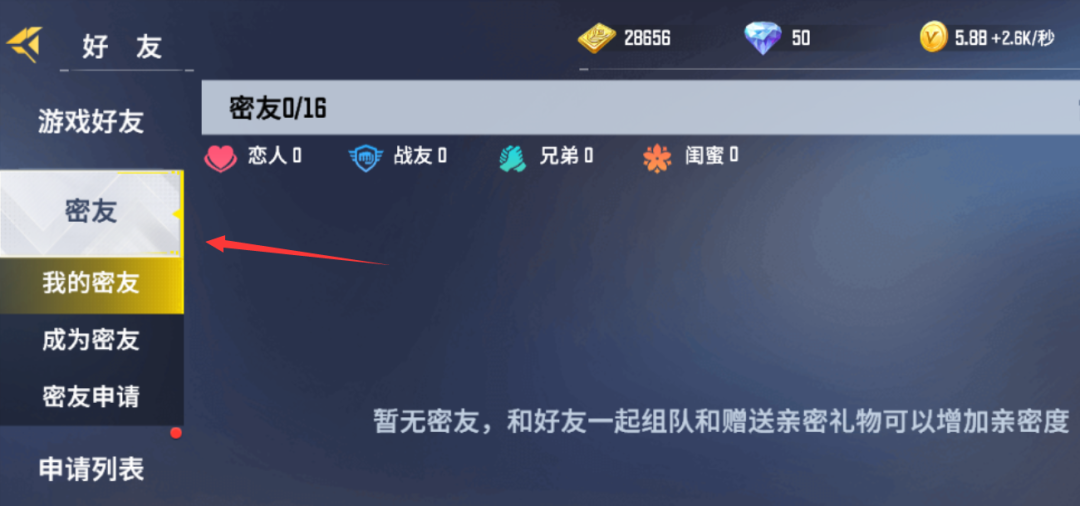 当与好友亲密度值满100时,可以申请和好友建立密友关系