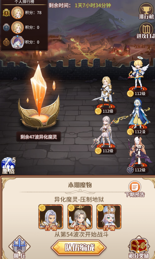 每10层会有一个BOSS,每个玩家挑战一次BOSS都会给军团所有玩家加一个鏖战的BUFF(增加攻击力和防御力),弱点的玩家可以等大佬将BUFF叠起来后再来打(不要错过挑战时间即可)。并且一定要注意第一队应该尽量选择不被魔物压制的组合。
