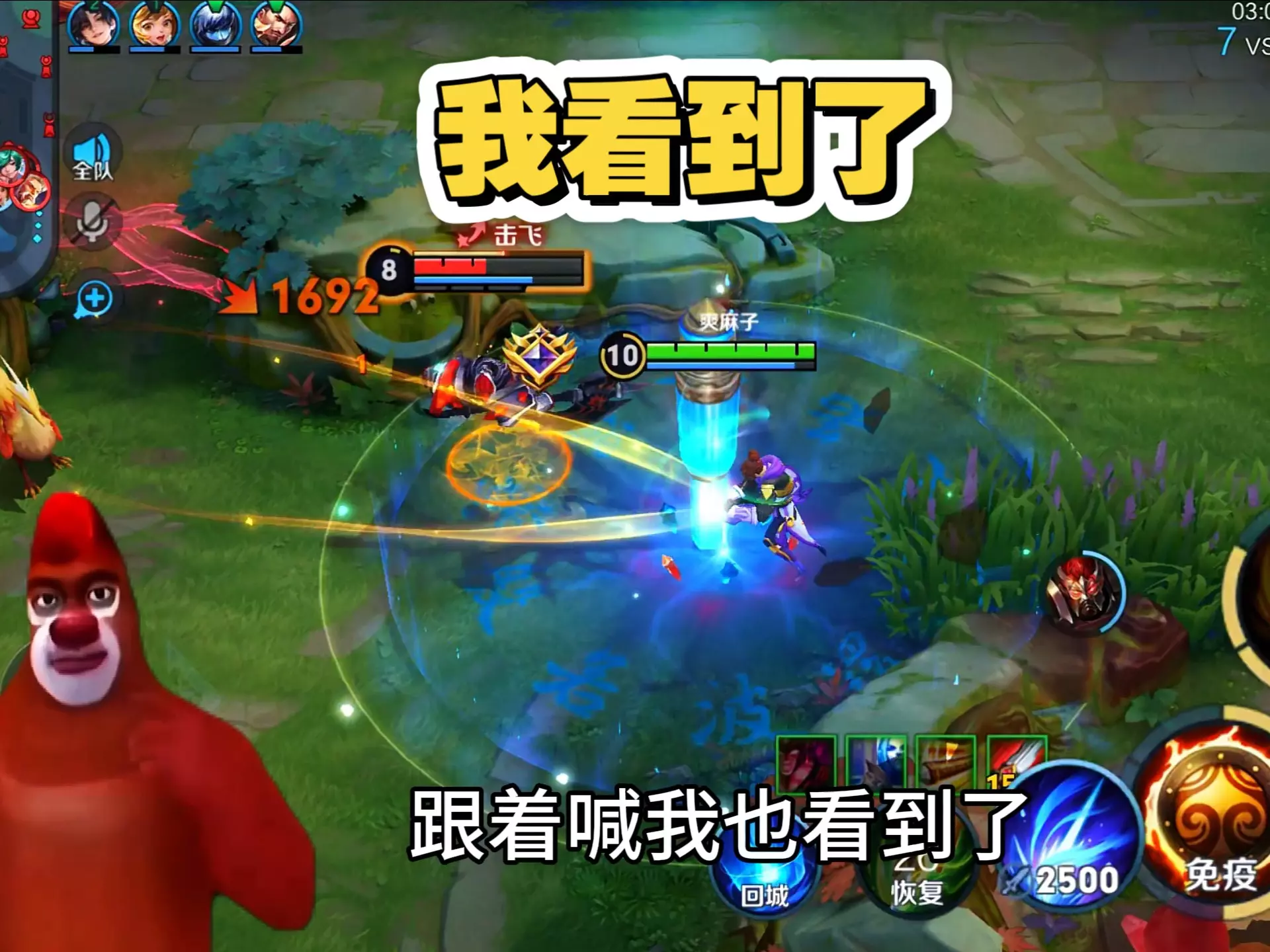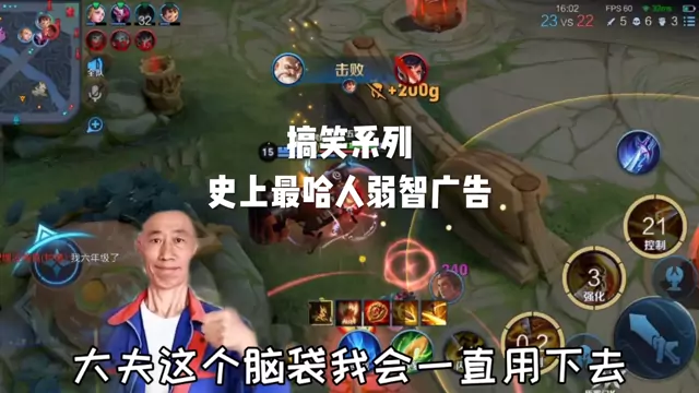 这是一段《王者荣耀》的搞笑配音游戏视频,展示了孙策在对局中的操作,满血状态的蒙犽被孙策撞后直接残血,搭配趣味表情包,带来搞笑的游戏体验。