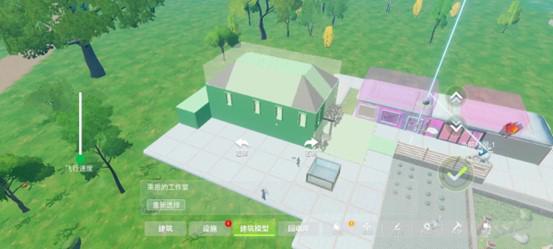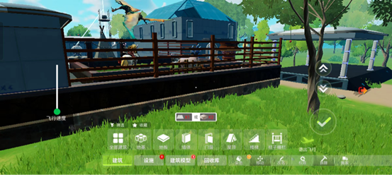 除了普通建造,我们还可以点击绿色的飞行建造按钮进入飞行建造。飞行建造模式下,我们拥有高度自由的视角,可以自行调节飞行的速度,穿越墙体,深入屋内进行建造听起来是不是很酷呀。