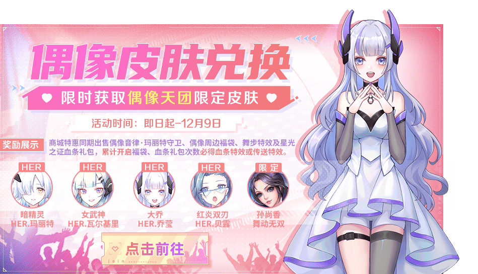 偶像皮肤兑换开启,通过每日登录等方式获取兑换币,累计兑换币可兑换暗精灵-HER.玛丽特、女武神-HER.瓦尔基里、大乔-HER.乔莹、红炎双刃-HER.贝露偶像天团限定皮肤等你来拿。