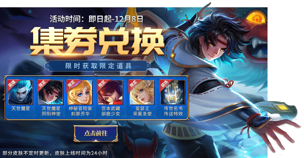 限时兑换积分英雄及皮肤,灭世魔星、灭世魔星-阴阳神使、神秘冒险家-刹那芳华、宫本武藏-驯鹿少女、亚瑟王-荣冕圣使、传世名书传送特效、绯雨剑星-狂躁之夜皮肤碎片礼包、暗月猎手-半藏新传皮肤碎片礼包等好礼等你来拿!