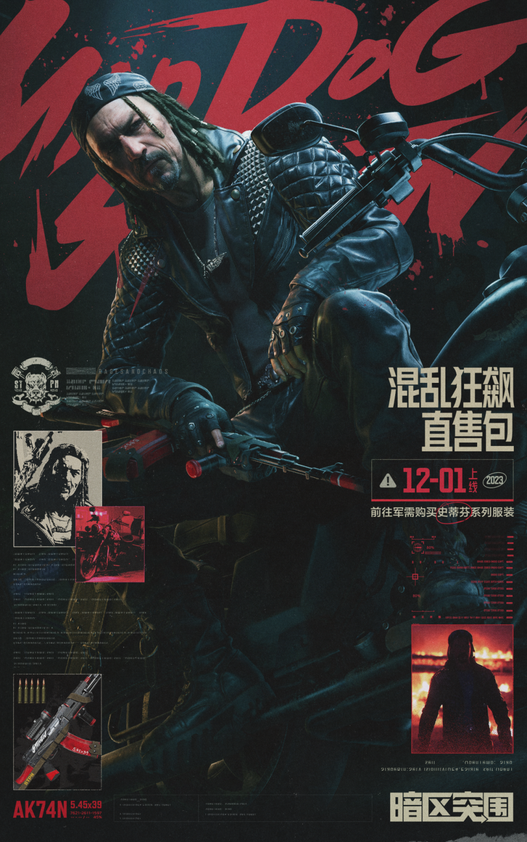 混乱狂飙直售包上线,全新「机车朋克」系列装扮上线,解锁首领史蒂芬同款战衣,全新涂装斗犬·AK74N带你领略最狂野的机车朋克文化!