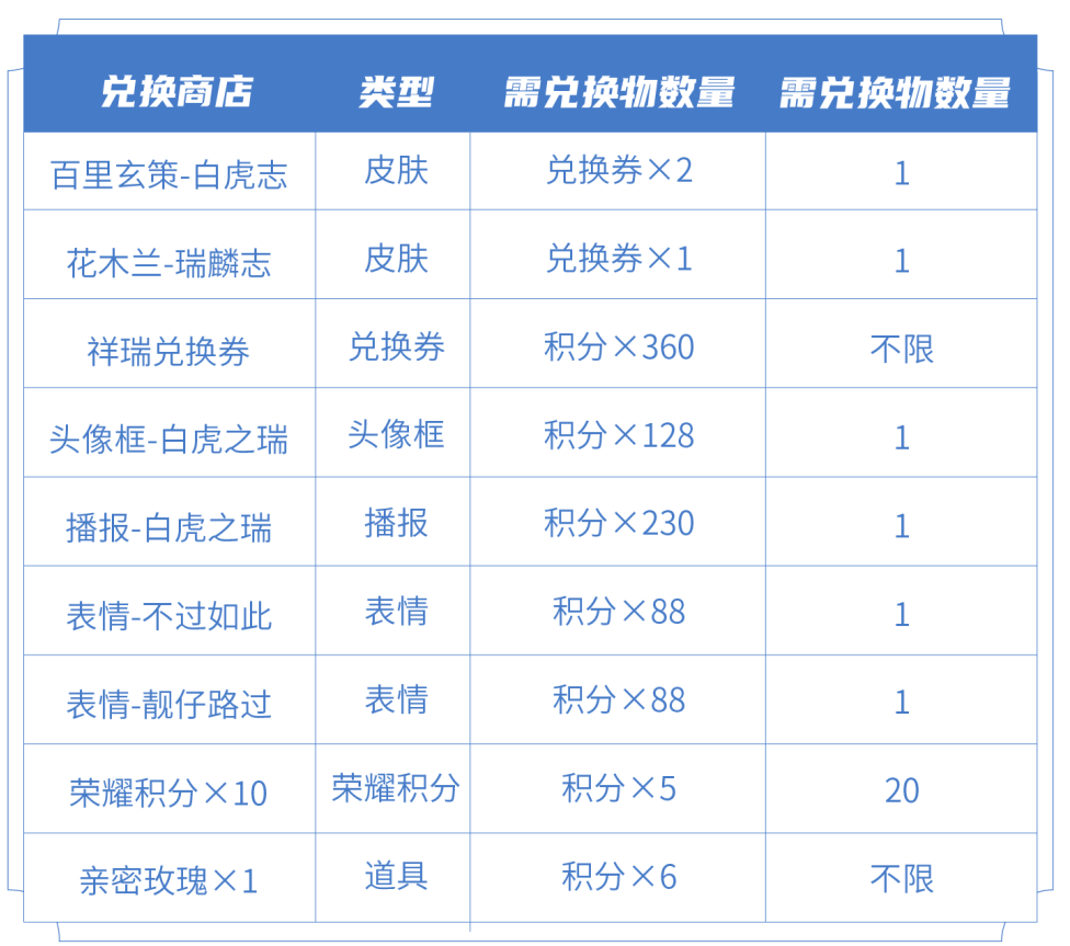 ◆◆兑换商店奖励一览: