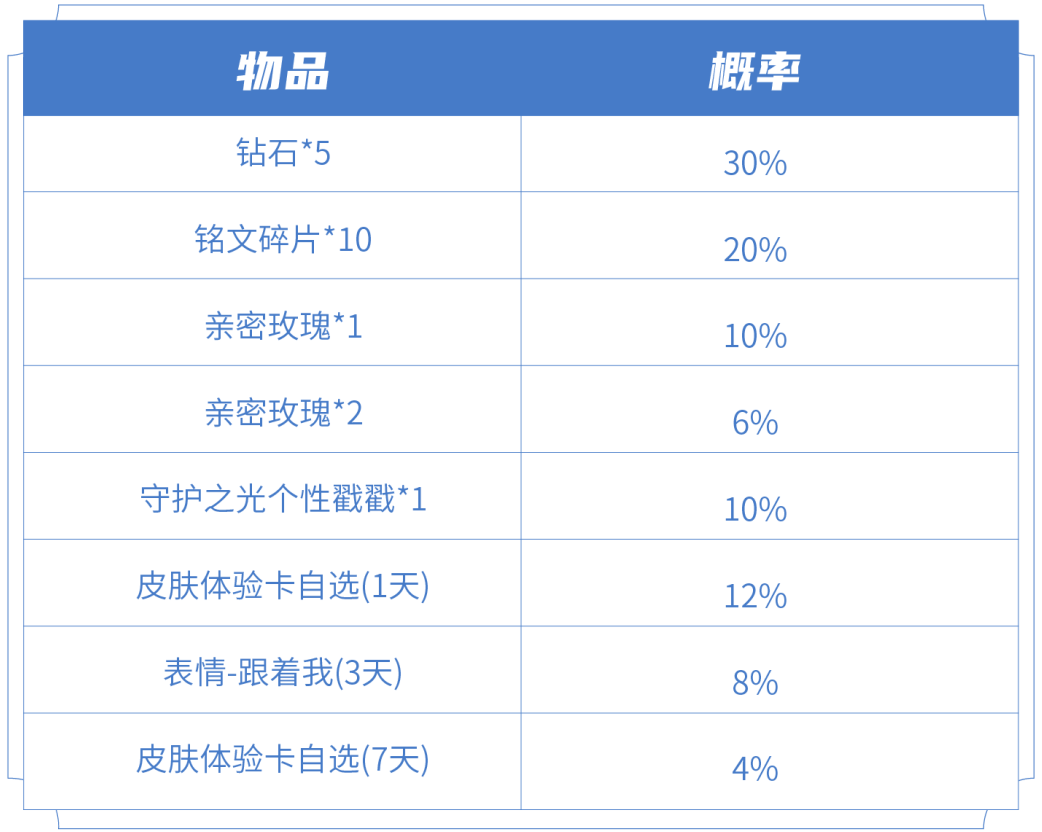 ◇12月8日开启印章抽奖,玩家可消耗印章在奖池中抽奖,有概率获得钻石*5、铭文碎片*10、亲密玫瑰*1、亲密玫瑰*2、守护之光个性戳戳*1、皮肤体验卡自选礼包(1天)、表情-跟着我(3天)、皮肤体验卡自选礼包(7天)等;
