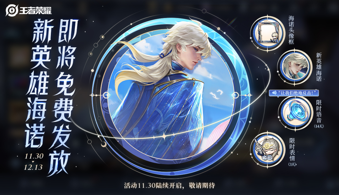 时光聆音宝箱(含海诺英雄宝箱、海诺头像框)、海诺体验卡宝箱(含海诺英雄体验卡(1日)x7、朵莉亚手办50元券、海诺朵莉亚指定周边8折券、概率得朵莉亚亚克力牌兑换券)、限时表情“撤回”(3天)、限时语音“让我们绝地反击”(14天)。