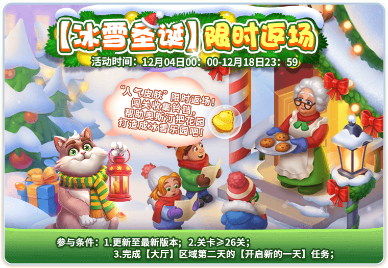 闯主线关卡收集皮肤代币——铃铛🔔,兑换冰雪圣诞皮肤装扮,帮助管家打造冰雪乐园吧!