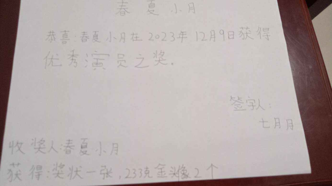 恭喜!春夏小月,注意,这是草稿奖状,今天就回去打印