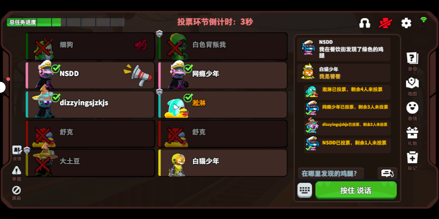 因为绿色一号骂我,说我*,非说自己是警长,结果最后被举报禁言,还被杀死了😂