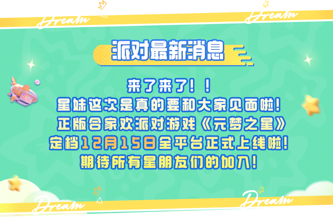 好消息,好消息(*^▽^*),《元梦之星》距离全平台正式上线只有5天啦!星妹给造梦空间加入了很多新内容,期待星宝们12月15日能够前往造梦空间探索哟!