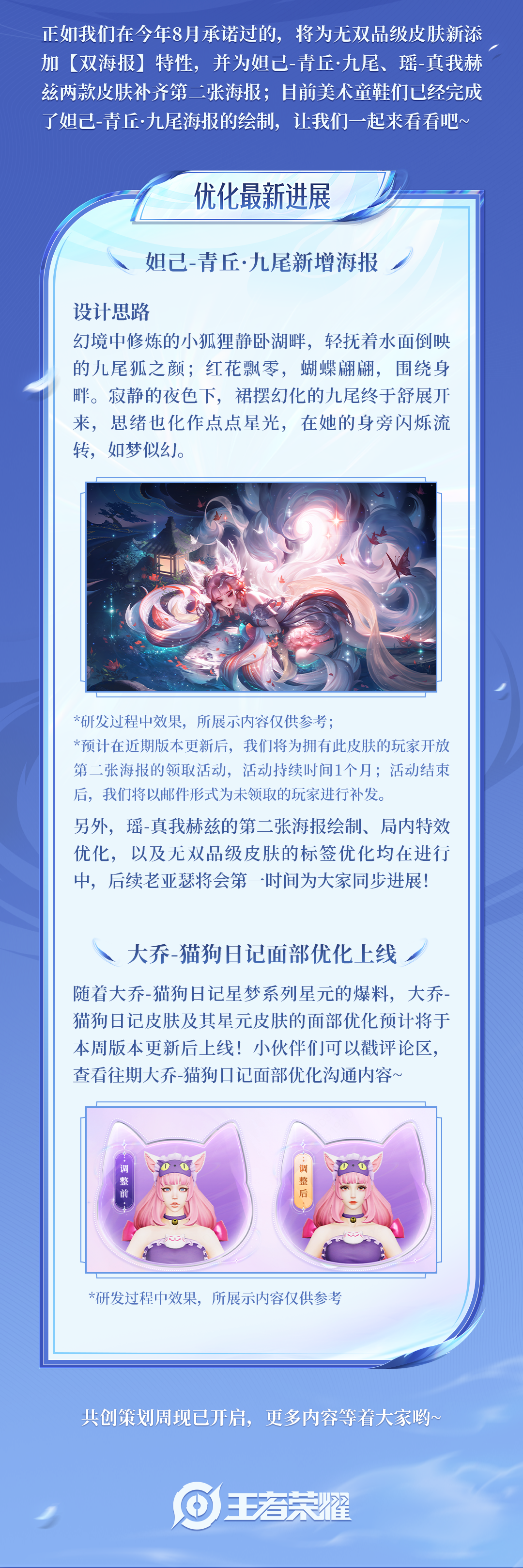 本次要为大家带来的是妲己-青丘·九尾新增海报与大乔-猫狗日记面部优化上线的最新消息!快来一起看看吧~