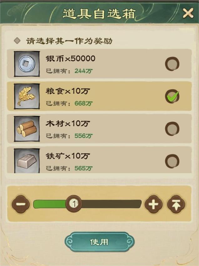 使用1个资源宝箱可获得10w粮食
