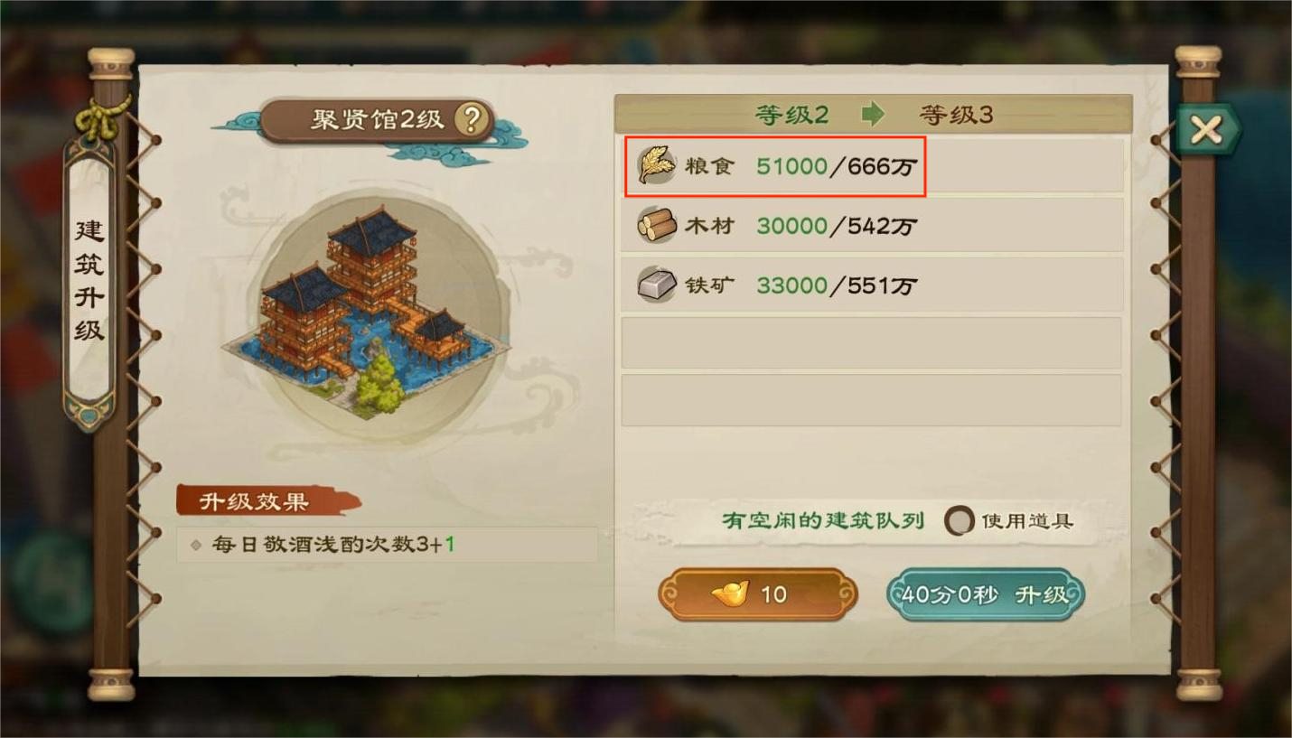 升级封地内的建筑需要消耗粮食