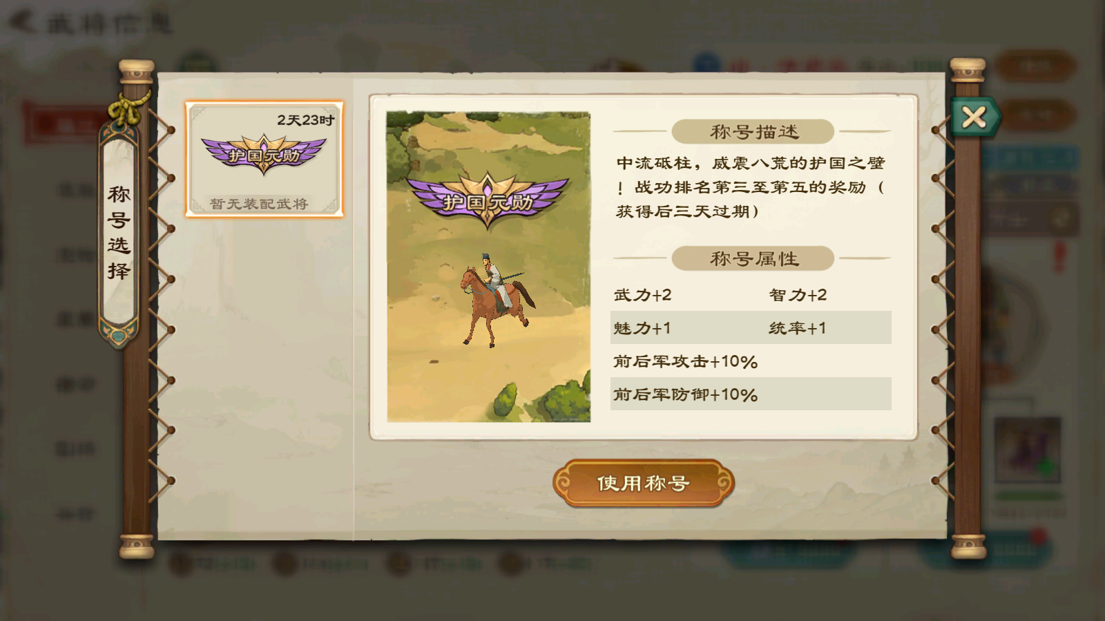 通过活动获取到的称号一定要及时给武将使用,并且称号一旦装配在有效期内无法卸下,所以在选择时需要谨慎哦。