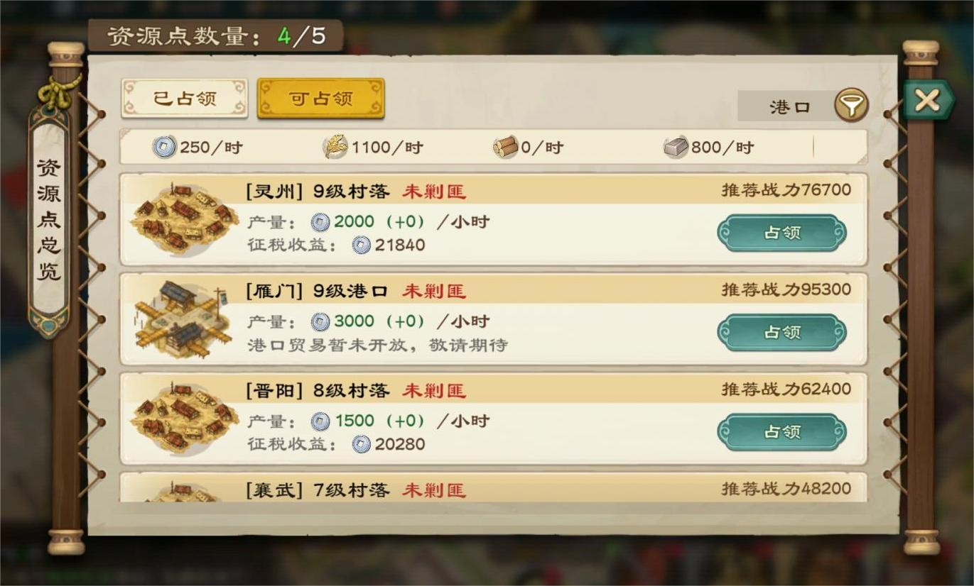 占领的村落和港口资源点也会产出银币,等级越高产量越多
