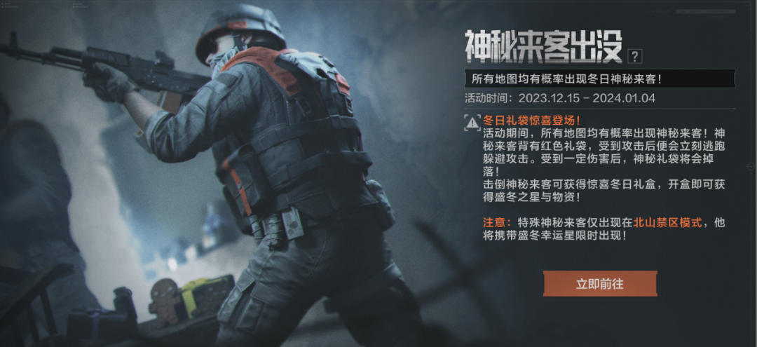 冬日已至,忙于冲锋陷阵的先锋偶尔也要享受一下难得的休闲时光。恰逢神秘来客携冬日礼袋登场,冬日寻宝活动正式开启,限时装扮等你赢!北山禁区优化返场,无需装备轻松开局!